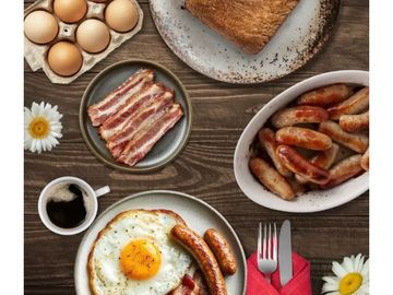 A delicious breakfast with Fresh bread, free range eggs, delicious bacon and sausages, Heinz beans, Norfolk mushrooms.